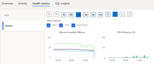 Health Metrics: Displays critical metrics such as connection trends but also CPU, memory used for example, AOS load, SQL locks, long queries, user sessions, events.