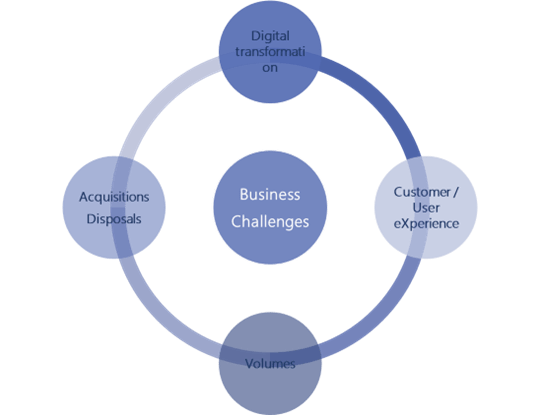 When we talk about business challenges, we are talking about digital transformation: companies now want to implement a digital transformation as part of the reform of their value proposition. Concretely this means more interfaces between the different systems, of course this digital transformation must have a strong impact on the Customer/ User experience (CX, UX). Obviously, the business challenges are issues of volume that is growing because systems have more users, histories, and acquisitions/ disposals of businesses: the market is dynamic and such operations are common.