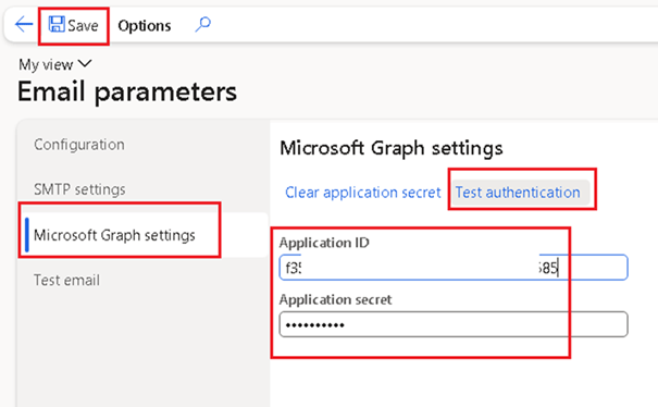 3. Then go to Microsoft Graph Settings > Enter application Id and application secret value copied from the Azure app registration and click Save.