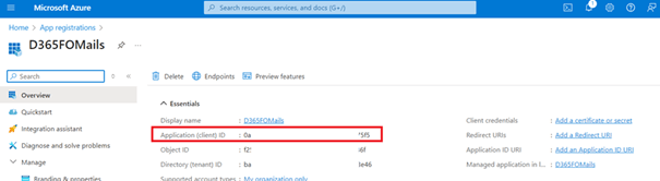 6. Once the app is created, copy the Application (client) ID as you will use this value to connect to the Microsoft Graph service from your finance and operations environment.
