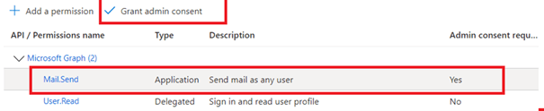 15. Then select Grant admin consent for to allow emails to be sent.