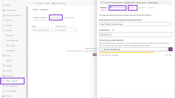 You can simply start the ticket creation process and choose a category. . As I start typing, I get a list of known issues and context. I can move on to trying to get a solution or use Copilot. This function will look at the telemetry of your environments, see if there is something like a problem. He suggests documents. Then, of course, you can go on and create the known ticket that occurs at that time