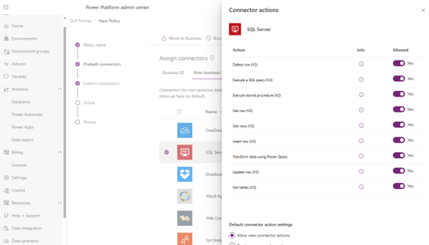 Finally, we have this section called Policies, which is related to Governance and security for your tenant. Data policies allow you to control the use of connectors in low code applications. As an administrator I can say that I want to block the use of certain connectors, or vice versa indicate which ones they can use. I can define more granular actions they cannot perform. Once you have defined your Policy, you choose the environments to which you want to apply this Policy. You can imagine a Policy applying to all your developer environments, to all your sandboxes, to all your production environments, or a certain Policy by Geo