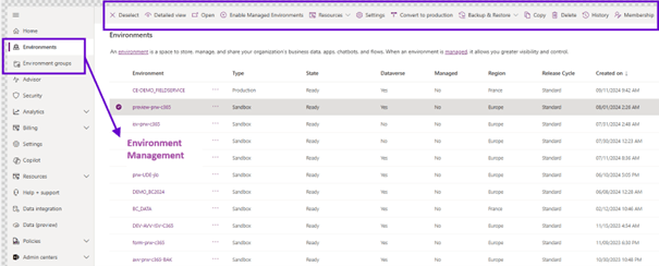 In the left navigation menu, we have a set of options for managing the environment. You can see all the environments through the tenant. You can perform a large number of actions directly from this page, instead of having to click on each environment and start a copy or a backup, etc
