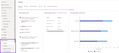 Then we have the resources. This is capacity management. So when you purchase Dynamics or Power platform licenses, they come with storage and will appear as gigabytes here for both Dataverse and Finance and Operations. You will see what you have at your disposal in the overview. You can explore the environments and click to see where storage consumption is.
