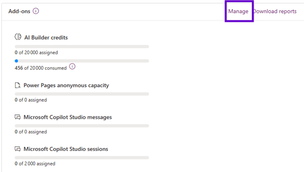 On the summary tab, we have a section add ons as well. You can click on the Manage tab and choose an environment and assign different types of add ins available. Some of these additions are added with the initial purchase of licenses. Other add ons that you can actually just buy ad hoc through the Microsoft 365 admin center.