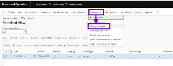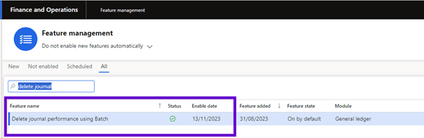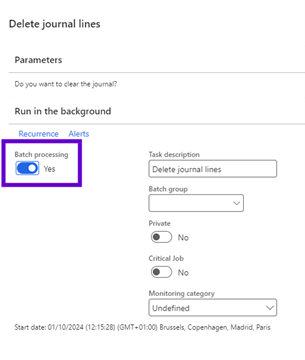 In version 10.0.34, the functionality “Delete journal performance using batch” is available. This feature allows you to schedule a deletion of financial journal lines via batch processing.