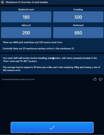 The Warehouse Management mobile app provides a workload page that displays work summaries and AI-generated insights to help warehouse employees better plan their work. Information may include the following: