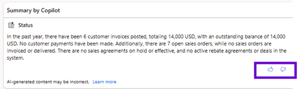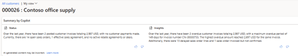Copilot contextual summaries are AI-generated summaries with information about the specific data present in D365FO depending on the form you open. In version 10.0.41, the contextual summaries of Copilot are enabled by default, which means that users will find these features when working with D365FO.