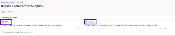 In this form, the copilot’s context summary is divided into “Status” and “Insights”: