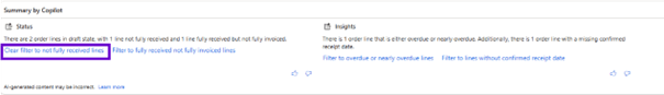 The Details page of all purchase orders includes a FastTab Summary by Copilot that displays an overview of the status of the selected purchase order. For example, it indicates the number of lines partially or fully confirmed, received, and invoiced. The FastTab also displays other selected information, such as a summary of late or near late command lines.