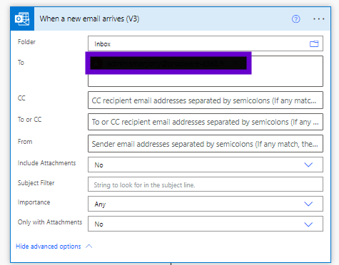 Select the “When new email arrives” automated flow and fill in the field To: