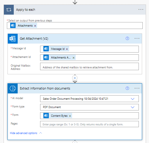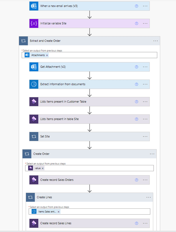 In the Power automate, the objective when a new mail arrives is to extract the data needed from the document using the AI builder model and after creating in D365FO the Sale order.