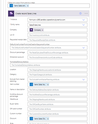 Provide the D365FO instance and AI Builder fields for the sales order header and sales order lines in Power Automate.