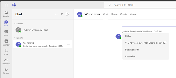 I have customized the Power Automate flow by adding the ability to have for the person who is responsible at the sales level to have the information in Teams:
