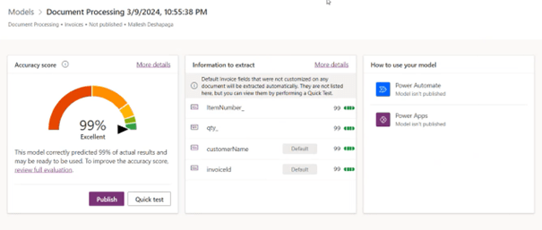 Add the end, your model is trained, and you have the accuracy score: Ai Builder applies your AI Model to the testing dataset to calculate the accuracy. Then you need to Publish your model.