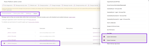 - The system administrator and system customizer roles in the Power Platform admin center.