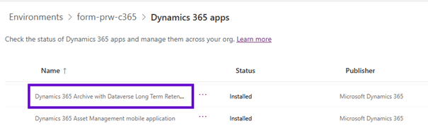- Install Dynamics 365 Archive with Dataverse long term retention from the Power Platform administration center.