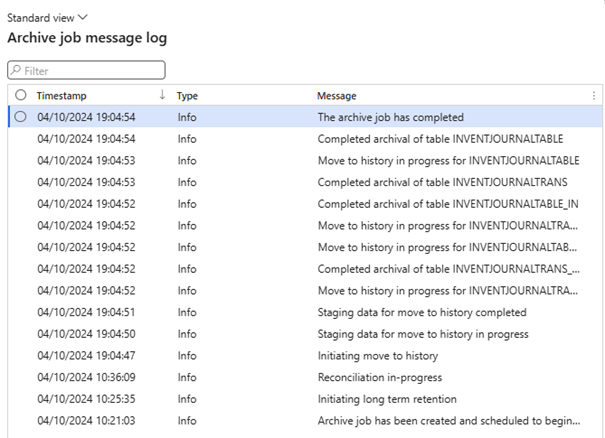 The Finance and Operations Archiving workspace provides the following details on the archiving process as it progresses through its various stages.