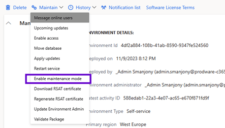 - In Microsoft Dynamics Lifecycle Services, select the environment and go to Maintain > Enable Maintenance Mode.
