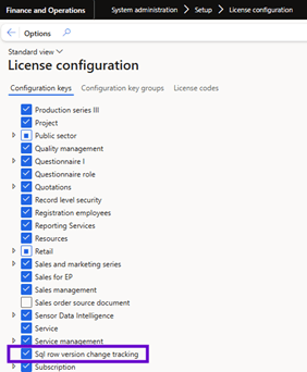 - Log in to the Finance and Operations applications and go to System Administrator > Setup > License configuration. Check the SQL row version change tracking checkbox and select Save.