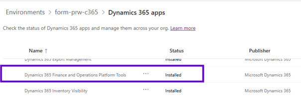 - If the Dynamics 365 finance and operations platform tools app is not installed in the Power Platform admin center for the selected environment, install it.