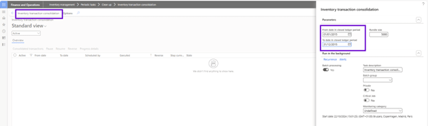- In the Actions pane, select Inventory transaction consolidation to create a consolidation of inventory transactions.