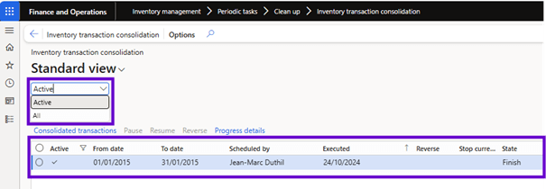- When you audit inventory transactions from associated documents, such as purchase order lines, they are displayed as consolidated. To view consolidated transactions, you must go to Inventory management > Periodic tasks > Clean up > Inventory transaction consolidation.