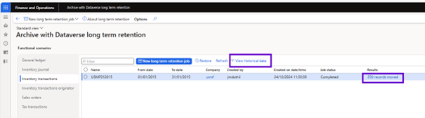 When the long-term retention task moves archived inventory transactions from InventTransArchive table to Dataverse long-term retention, the same data is replicated in InventTransArchiveHistory table. To display historical data in the InventTransArchiveHistory table, do the following.