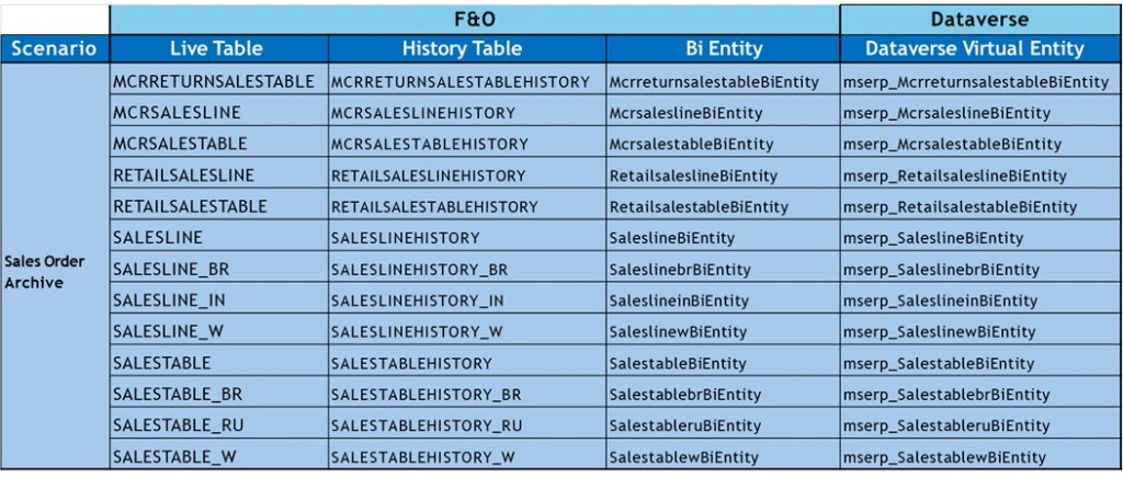 So just think about an example of the sales order archiving process which has thirteen tables in it. So, you can see all the thirteen tables listed here and the map and the mapped history tables. And you can also see the map bi entities and the Dataverse virtual entity. We are doing one by one mapping. So, thirteen tables in sales order archival scenario, we have thirteen bi entities and thirteen history tables.