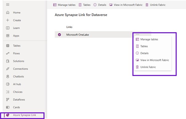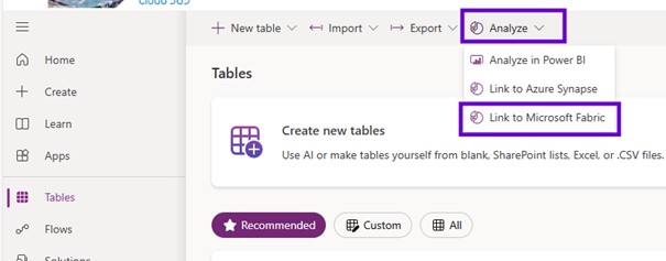 I created that link: you need to go to the maker portal one more time and using that maker portal very first thing you go to the tables and click on to the analyze and link to Microsoft fabric.