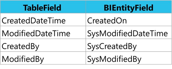 Last point concerning properties on tables, on the live tables, you have turned on or even Microsoft has turned on created date time, modified date time… you need to pay a little bit attention here is that you need to for history tables. Modify table properties through Table Extension on Corresponding History Table. In BI entity, you need to manually add those columns. Create Custom fields through Data Entity Extension using the following naming convention:
