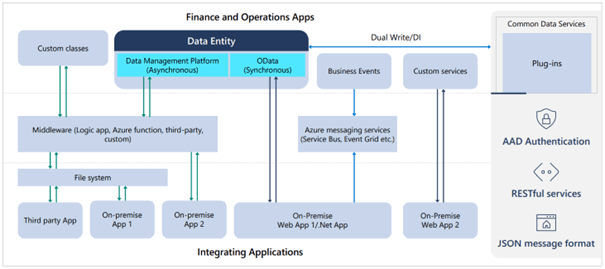 The OData service endpoints should be used for the integration scenario when real-time data is required. For example, when a product is created or modified in the third-party application, the user will see the same changes in D365 Finance in real time.