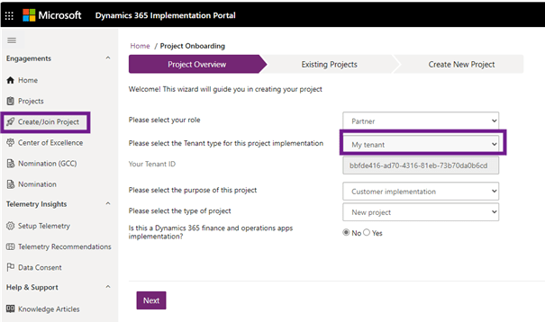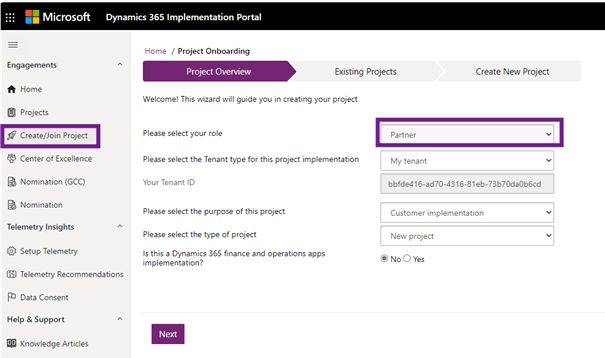 - Partner implementation: Choose this option if your project is being implemented for a Microsoft partner, such as when you implement Dynamics 365 for your own organization as a Microsoft partner.