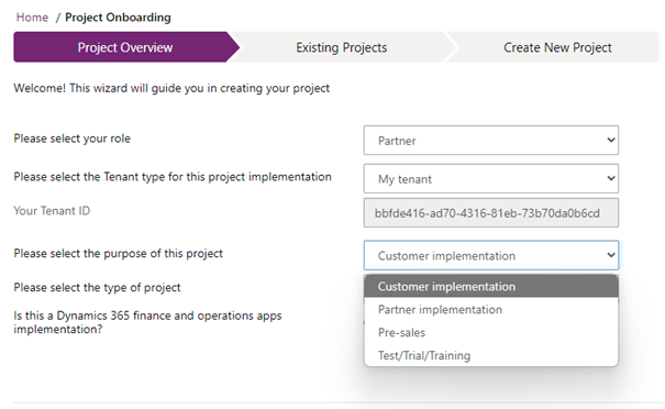 - Customer implementation: Choose this option if your implementation project is being implemented by a Microsoft partner for a customer, or if you are a customer of Microsoft and implementing Dynamics 365 without a Microsoft partner.