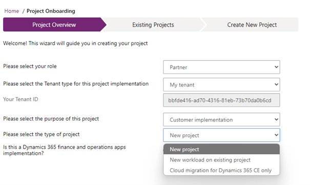- New workload on existing project: Select this option if you are implementing a new workload on an existing project. If there is already a project that has gone live, and you are adding another app to the existing implementation, choose the new workload on existing project option.