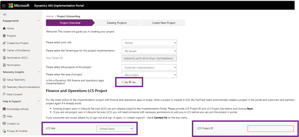 - LCS Project ID: Provide the Lifecycle Services project ID related to this implementation project. If you proceed to create a new project, this Lifecycle Services ID is linked to the newly created project.