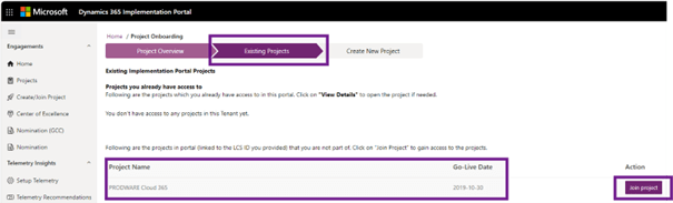 Existing project users in Lifecycle Services can join the associated project in the implementation portal (if one exists). If you are not a project user in Lifecycle Services, the associated implementation project will not appear on the next screen. You will need someone with the necessary permissions to add you in LCS before you can join the project in this portal.