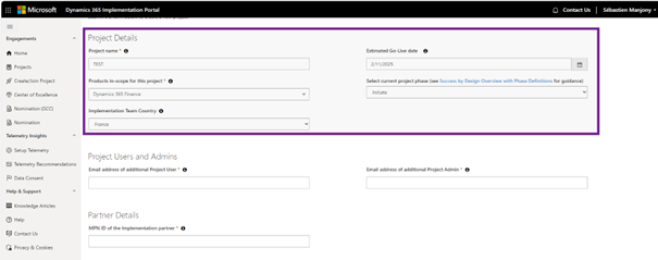 Both fields can be modified once the project is created via the View/Edit Project Details option. The toggle button Do you have an implementation partner? is not visible if you are a partner or create the project as a partner and the MPN ID is a mandatory field in these scenarios.