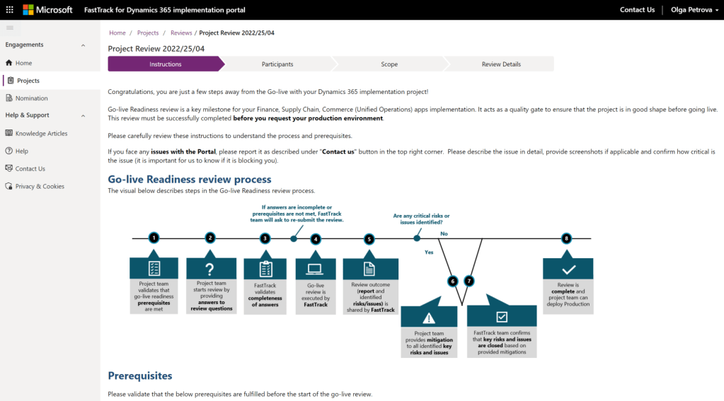 Once your project is set up, you can proceed to project reviews. The final project review is the FastTrack team’s go-live Readiness Review .