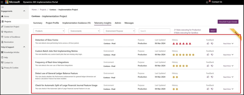This tab is visible for all projects created with the integration wizard. Telemetry information detects optimization opportunities and provides practical guidance based on usage patterns in customer environments.