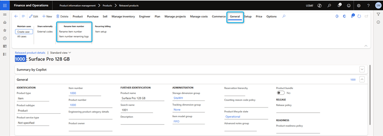 Go to Product Information Management –> Released Products and open a product. In my example, I opened the Item 1000 in an environment.
