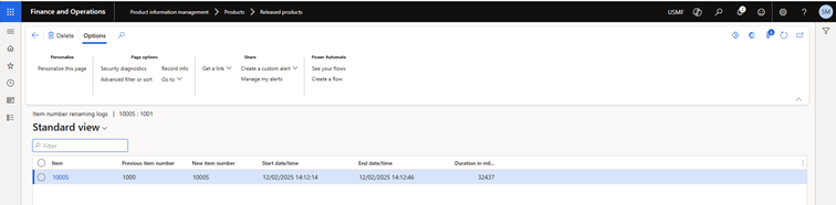 In addition, the entire renaming process is fully documented. The log is available in Product information management > Inquiries and reports > Item number renaming log.