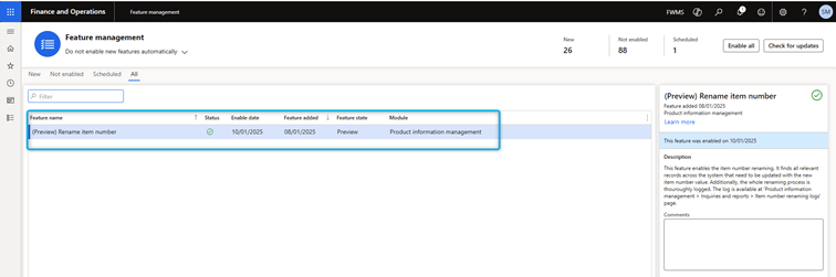 Navigate to Workspaces –> Feature Management and look for the “(Preview) Rename Item Number” feature. Enable the feature.