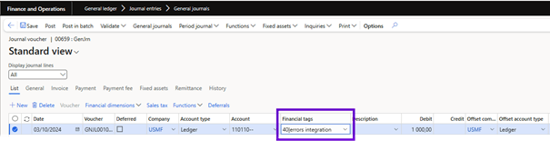 Financial Tags can be used in general journals. Here, you can select the “Financial tag values” by default at the log level for log lines.