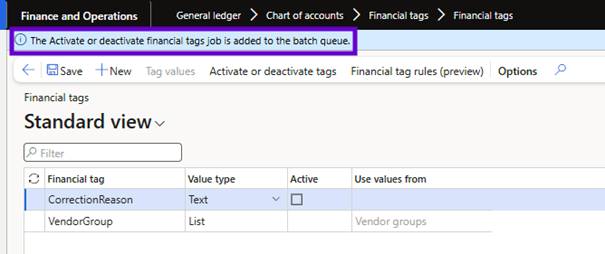 Clicking on “Activate or deactivate Tags” will create a batch jobs that will activate created financial Tags (or deactivate them if you want to disable a financial tag later):