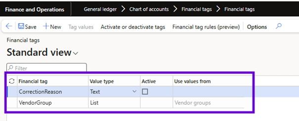 - Select New to create a financial tag.