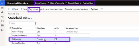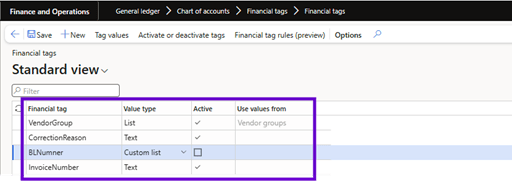 Once the feature is enabled, each legal entity can define up to 20 Financial Tags. Tags are specific to each legal entity. You can use the Financial tag configuration and Financial Tags custom list value entities to import the Tags for each legal entity. Therefore, you can quickly and easily define the same initial configuration in multiple legal entities.