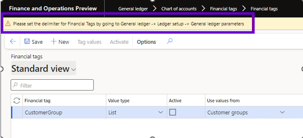 To use these financial Tags rules, the financial Tags must already be configured. And to enable financial Tags, you need to perform a basic configuration. One of the required steps is to configure the financial Tags delimiter. You should do this step wisely, for example because of its impact on the posting process!