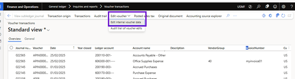 - Select the rows in Voucher Transactions , then select Edit internal voucher data. You can only edit the selected lines.